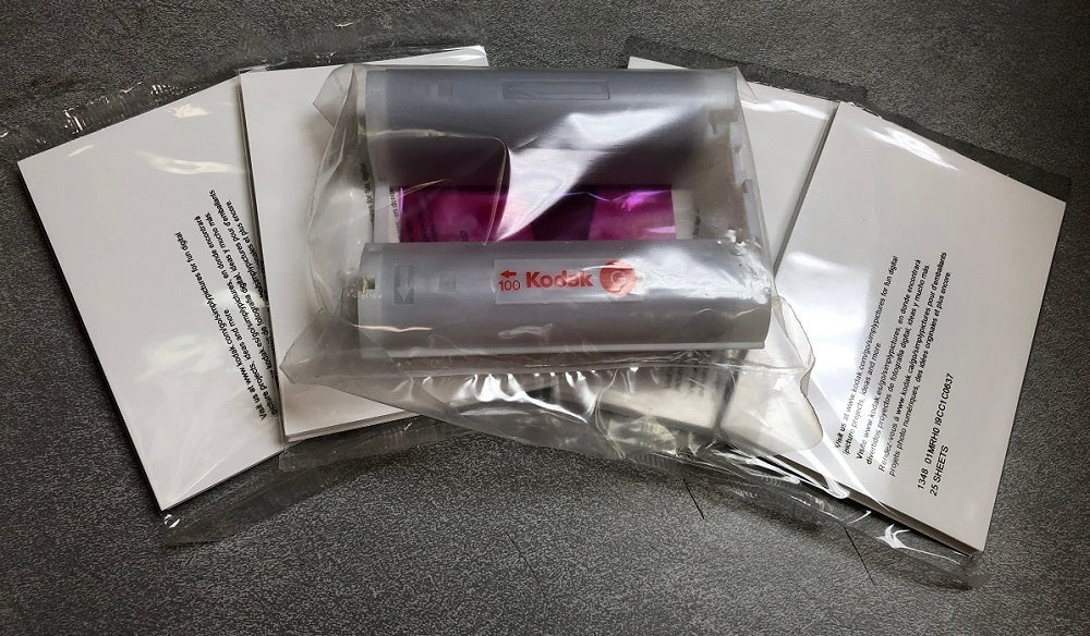 Kodak G100 color ink cartridge with paper packs (4 packs of 25 Sheets) for G600 Printer. Provides borderless acid-free prints with brilliant instantly drying colors. Waterproof and stain-resistant. Still in factory sealed packaging.
