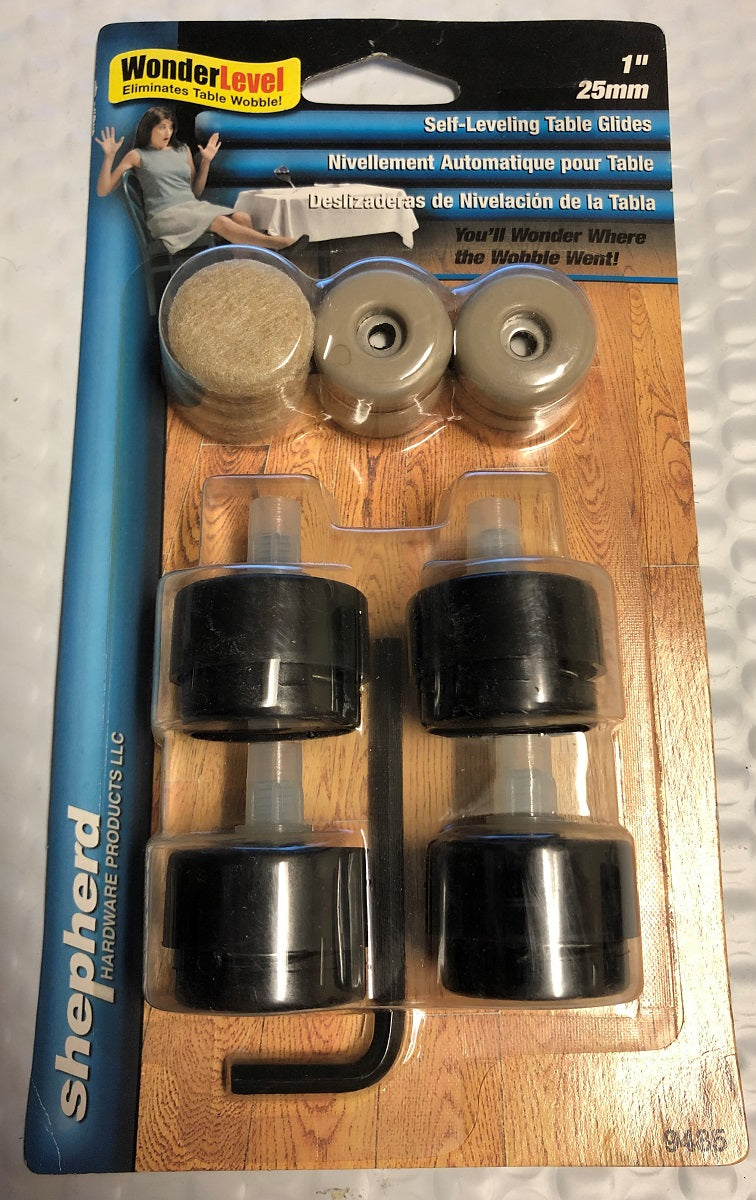 You'll wonder where the wobble went! Set of four 1" table levelers that automatically adjust to uneven floors. The glide has a self-levelling spring mechanism which adjusts when furniture is moved on floor. Ideal for uneven floor surfaces which create wobbly table. Automatically adjusts to uneven floors. Use with FeltGard pads for wood and hard surfaces or use SlideGlide pads for carpet. Load capacity: 35 lbs per leg.