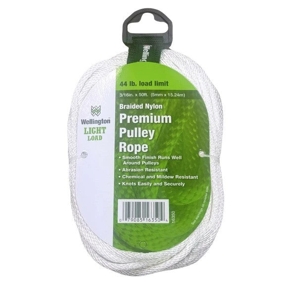 The Wellington 50 Foot x 3/16" Braided Nylon Premium Pulley Rope is designed for light load applications offering a durable and versatile solution for a variety of tasks. With a 44 lb. load limit this rope is ideal for use with pulleys ensuring smooth operation due to its abrasion-resistant braided nylon construction. The rope is also resistant to chemicals and mildew making it perfect for outdoor and indoor use. Its smooth finish allows it to run seamlessly around pulleys while its strength ensures secure easy knotting. Whether for light-duty lifting or securing items this pulley rope is a reliable and essential tool for everyday tasks.